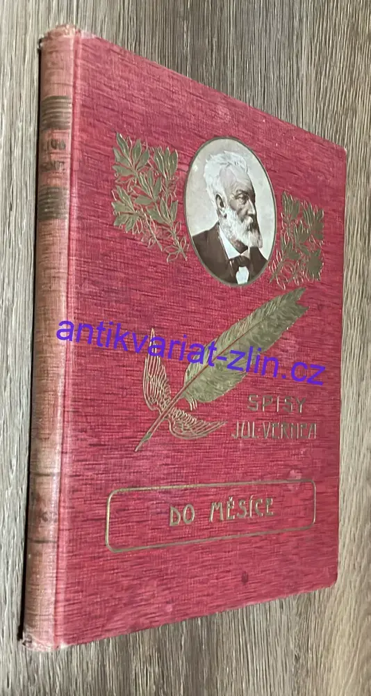 VERNE Julius, “Třiadvacítka” typu OKŘĺDLENÉ PERO, má pevnou červenou vazbu s vyraženým obrázkem Julia Vernea, se zlatým okřídleným brkem.
