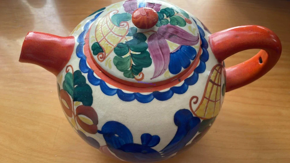 BEZ OŤUKŮ. JEMNĚ VYŠISOVANÁ GLAZURA. VÝŠKA K POKLOPU 18 CM, PRŮMĚR 15 CM, DÉLKA 27 CM (OD UCHA K NÁLEVCE).