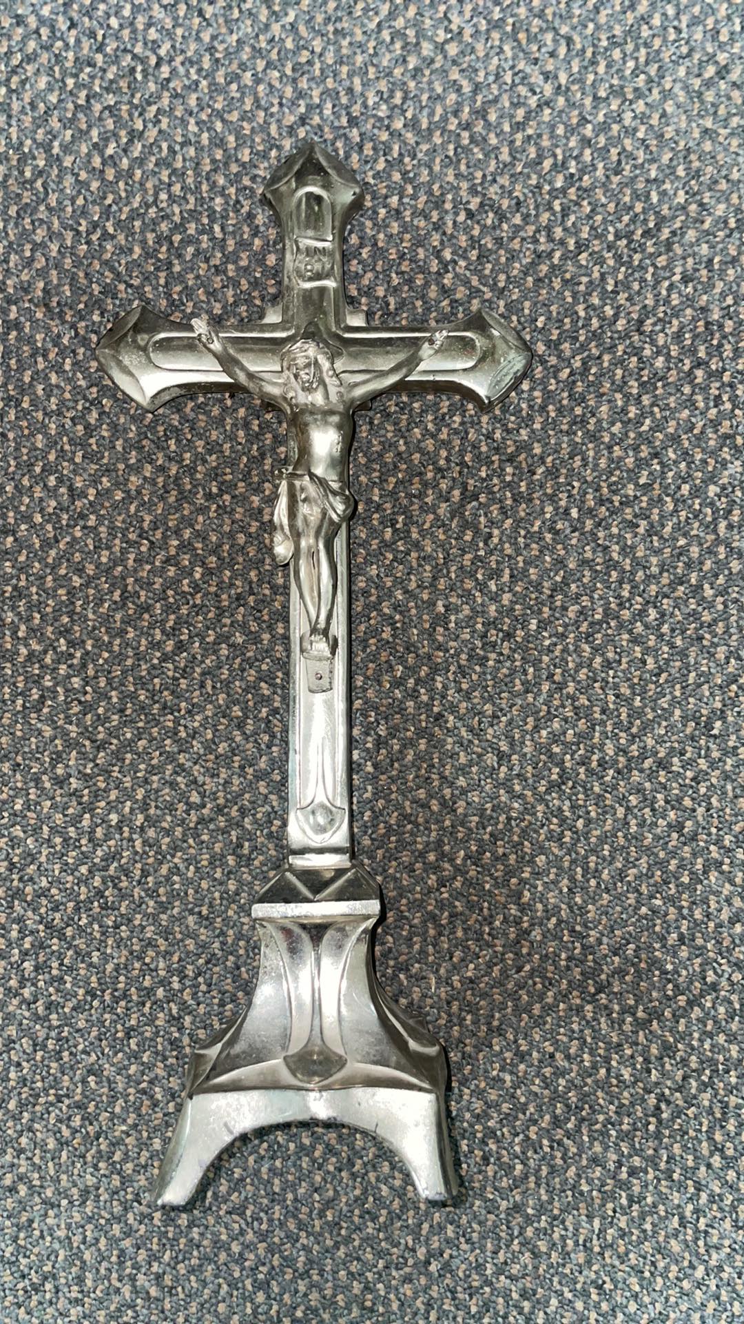 PLECHOVÝ, STOLNÍ KŘÍŽ 35 CM VYSOKÝ. POŠKOZENÍ DLE VĚKU KŘÍŽE (BĚŽNÉ).
